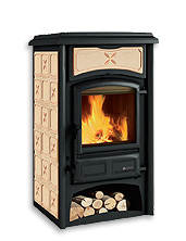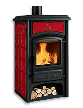 External facing of steel and majolika • Doors of cast-iron • Ceramic glass resistant up to 750°C • Wood-holder.